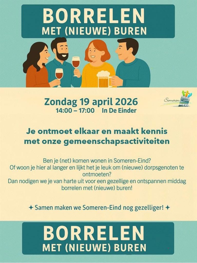 Dan nodigen we je van harte uit voor een gezellige en ontspannen middag borrelen met (nieuwe) buren! Tijdens deze middag is er volop gelegenheid om het dorp en de mensen van Someren-Eind beter te leren kennen onder het genot van een hapje en een drankje.