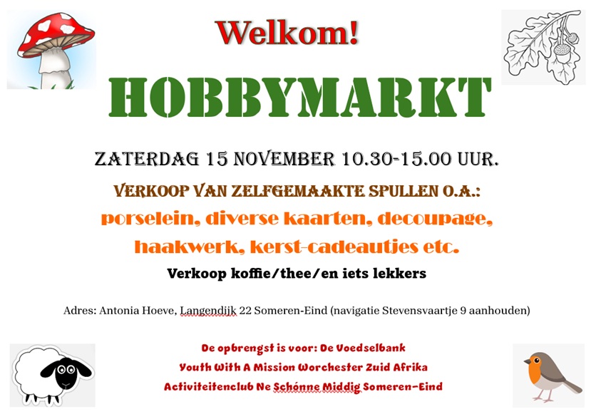 Op zaterdag 15 november is er weer een Hobbymarkt op de Antonia Hoeve, Langendijk 22 in Someren-Eind. Alle spullen die worden verkocht zijn zelfgemaakt of bewerkt.