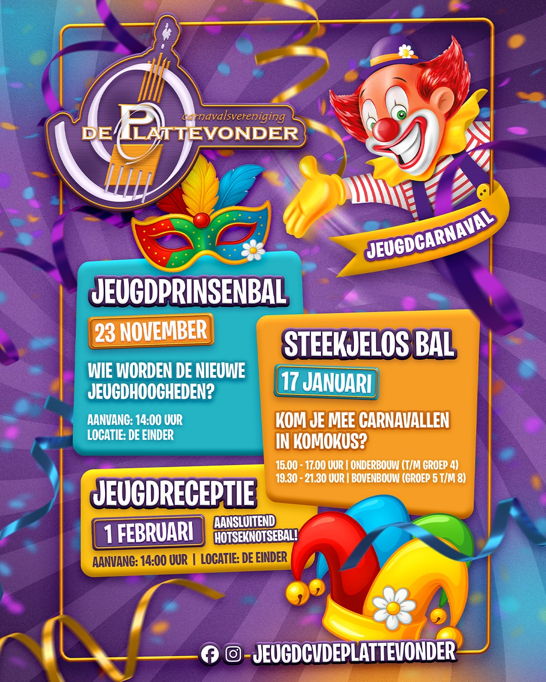 Wie worden dit jaar de nieuwe jeugdhoogheden van CV de Plattevonder? Op zondag 23 november barst in De Einder het spannende én feestelijke Jeugdprinsenbal los. Vanaf 14.00 uur staat de zaal in het teken van muziek, spellen, spanning en feestvreugde. De middag is voor iedereen gratis toegankelijk.