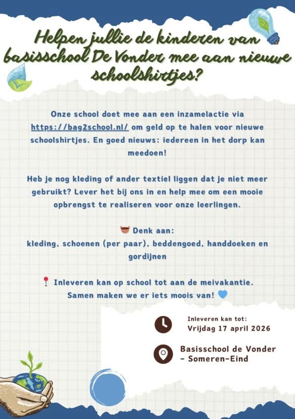 Basisschool De Vonder organiseert een inzamelactie om geld op te halen voor nieuwe schoolshirts. Samen met Bag2School roept de school inwoners op om kleding en ander textiel in te leveren.