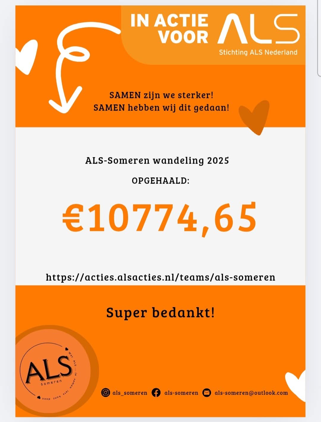 En dan het resultaat… met deze wandeltocht haalde ALS-Someren maar liefst €10.774,65 op voor Stichting ALS Nederland. Wat een bedrag. Wat een steun. Wat een kracht!