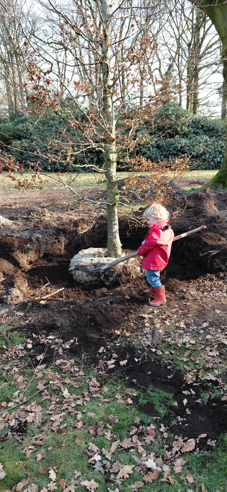 Gelukkig staat er nu een nieuwe, levende rode beuk in de tuin. Bij het planten hielp zelfs een kleine ‘tuinman’ mee. Dat maakte het moment extra bijzonder.
