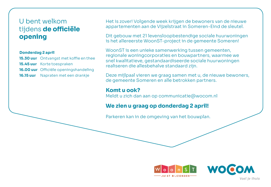 Graag nodigen wij u uit voor een bijzonder moment: de officiële opening van de nieuwbouw aan de Vijzelstraat in Someren-Eind. Het eerste WoonST-project in de gemeente Someren. We zouden het fijn vinden ook u daar te mogen ontmoeten.