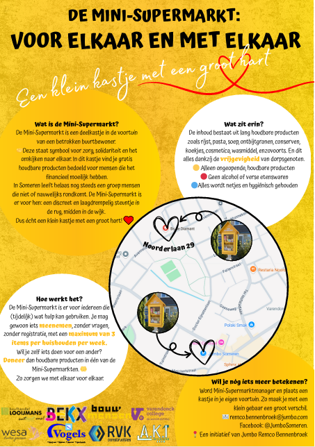 De Dorpsraad is benaderd door Remco Bennebroek van de Jumbo. Hij is op dit moment bezig met de MINI-supermarkt. Dit project loopt al in Someren en in Lierop maar hij wil dit graag uitbreiden naar de andere kerkdorpen. Hij is op zoek naar een manager voor de MINI-supermarkt in Someren-Eind. Als Dorpsraad willen wij hem hier graag bij helpen.