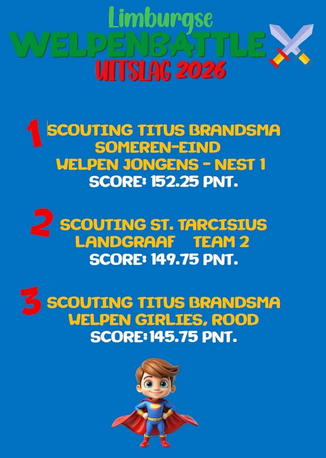De welpen van Scouting Titus Brandsma Someren-Eind hebben een knappe overwinning behaald tijdens de Limburgse Welpenbattle 2026. Het “Jongensnest 1” eindigde op de eerste plaats met maar liefst 152,25 punten.