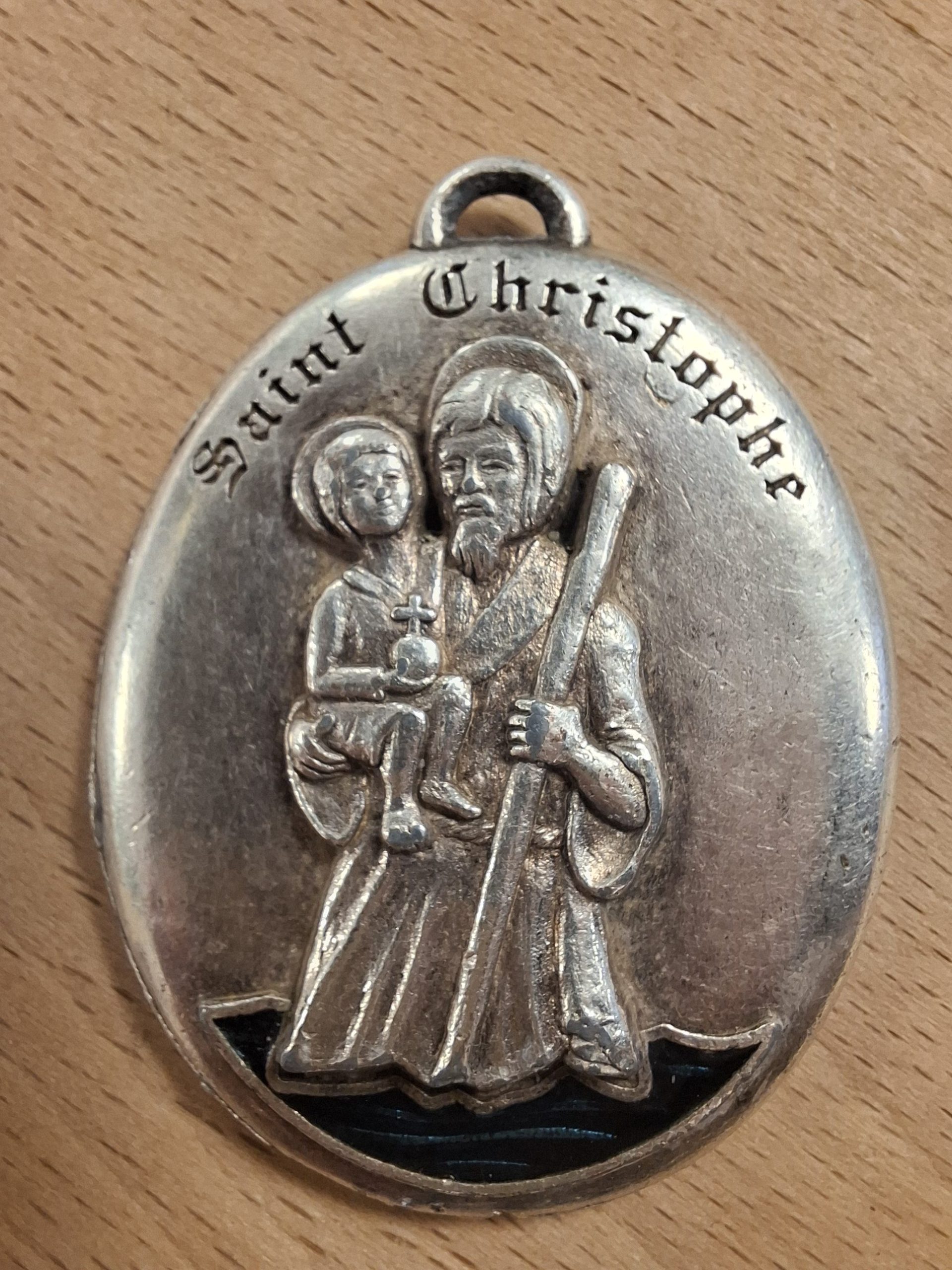 Het gaat om een medaille van de Heilige Christoffel, die traditioneel wordt gedragen als beschermingsamulet voor reizigers.